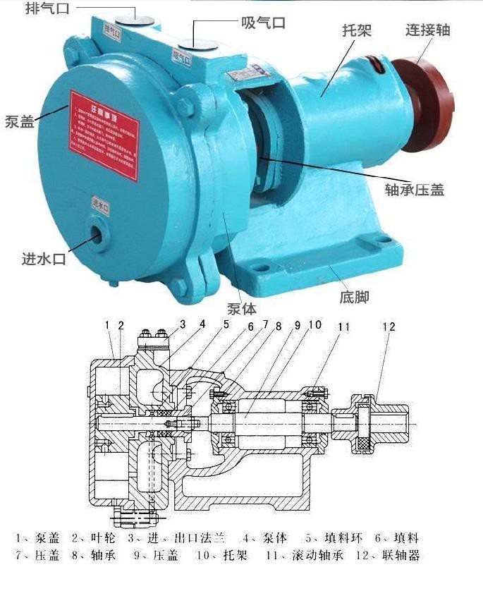 SZB懸臂式水環(huán)真空泵工作室由泵體、泵蓋構成,上有進排氣口,下有放水塞,泵蓋上有指示旋轉方向的箭頭,泵體有填料函和填料壓蓋,內(nèi)裝填料密封,泵體側面的螺絲孔為補充水環(huán)消耗用水。由鑄鐵制成葉輪,有12個葉片呈放射狀均分布,有平衡孔(其中兩個套扣供拆卸用)平衡軸向力。葉輪平鍵與軸聯(lián)接并可沿軸向滑動調節(jié)間隙。軸為鋼制成,支承在泵的托架內(nèi)的兩個滾珠軸承上,右端有彈性聯(lián)軸器和電機直接聯(lián)接。托架用鑄鐵制成,有止口保證與泵體聯(lián)接,軸承間有空腔,可存潤滑油,用稀油或齒油滑均可。從傳動方向看,泵軸為逆時針方向旋轉(右邊法蘭為排氣口,左邊法蘭為進